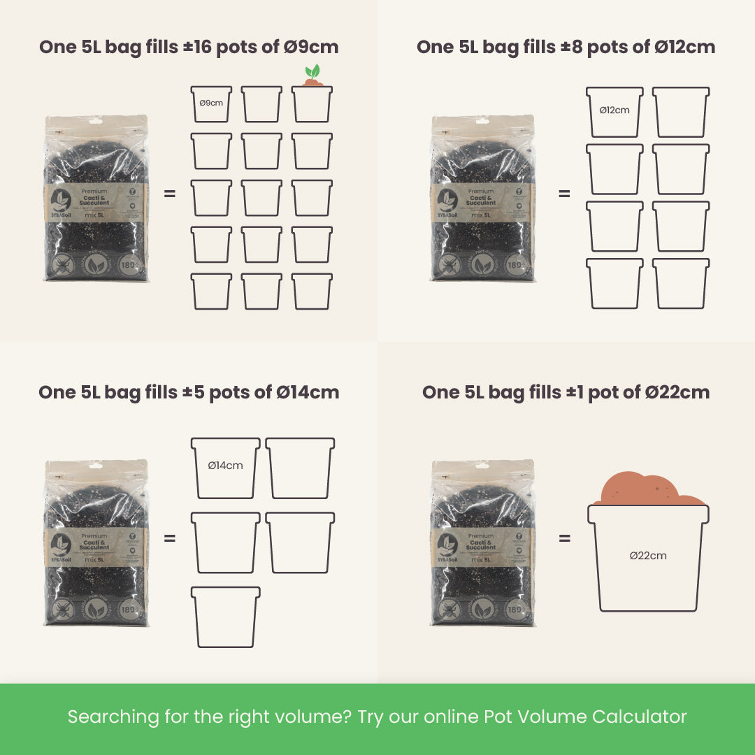 Check out this pot volume calculator tool to calculate how much Cacti & Succulent Mix you need.
