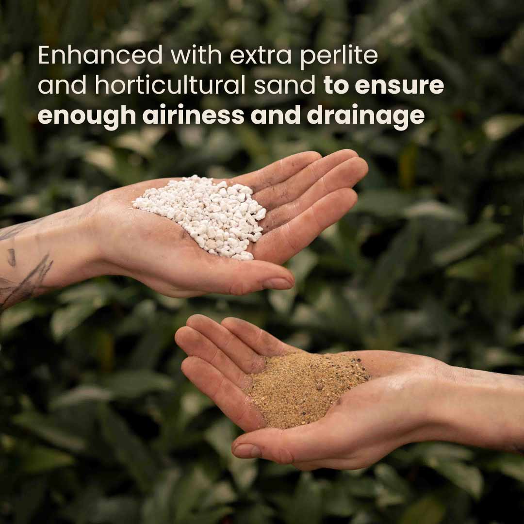 Os Ficus geralmente têm raízes grandes e volumosas. A casca extra e perlit dão às raízes o espaço de que precisam. A Carvão vegetal ativado adicionada desintoxica as raízes de problemas de apodrecimento e bolor. Combine isso com Areia para jardinagem extra para uma mistura mais densa e com melhor drenagem e você tem o Substrato para Ficus perfeito.